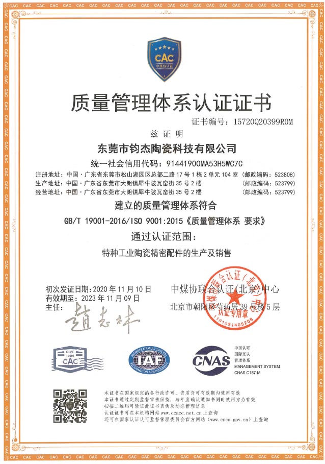 東莞市鈞杰陶瓷科技有限公司十分注重產(chǎn)品的質(zhì)量,為此我們引進了ISO9001質(zhì)量管理體系,并于2020年11月10日正式通過了ISO9001質(zhì)量體系認證。鈞杰陶瓷致力于為用戶打造優(yōu)質(zhì)的陶瓷精密部件,我們目前以為包括華為在內(nèi)的多家大型企業(yè)供應(yīng)陶瓷制品。