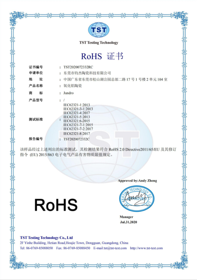 氧化鋁陶瓷是一種較為常見的特種陶瓷材料,鈞杰采用品質(zhì)優(yōu)異的進(jìn)口粉料,燒結(jié)出質(zhì)地優(yōu)良的氧化鋁陶瓷。我們的材料均已通過ROHS認(rèn)證。
