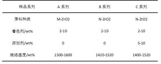 1、將氧化鋯粉體與著色劑、燒結(jié)助劑(Al2O3、SiO2等)按一定的比例配料(配方見(jiàn)下表,然后用行星球磨機(jī)球磨3h。